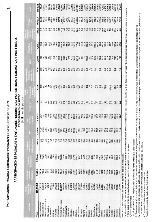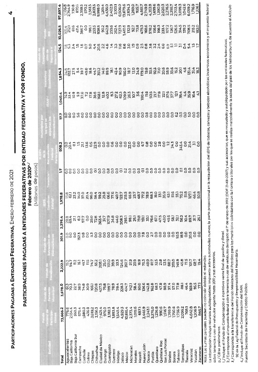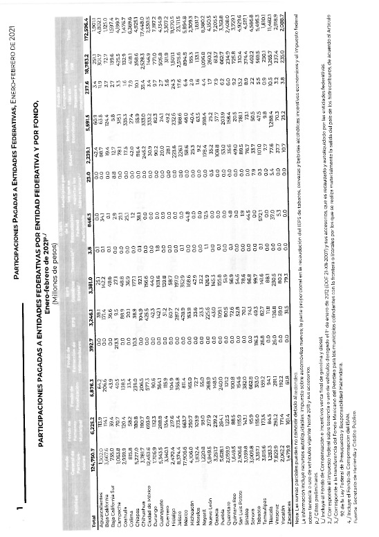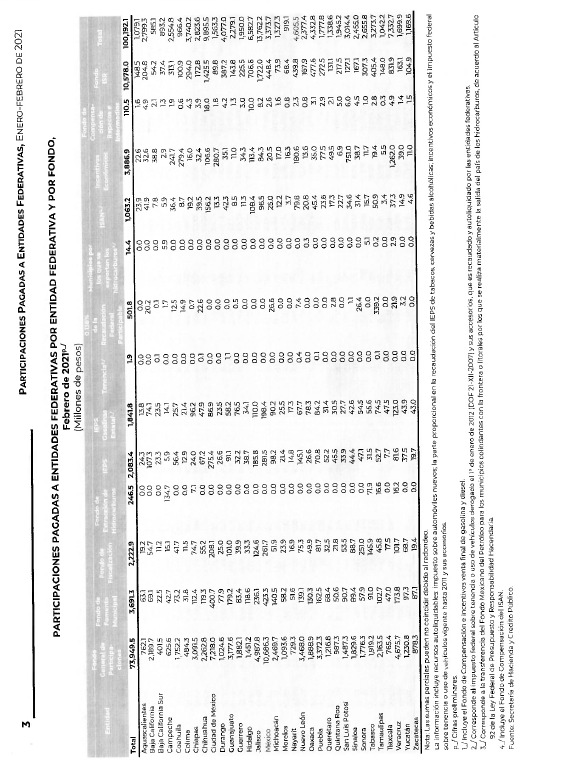De la Secretaría de Hacienda y Crédito Público, con la que remite información relativa al pago de las participaciones a las entidades federativas correspondiente a febrero de 2021, desagregada por tipo de fondo y por entidad federativa, efectuando la comparación correspondiente al mes de febrero de 2020.Se remite a las comisiones de Hacienda y Crédito Público, y de Presupuesto y Cuenta Pública, para su conocimiento